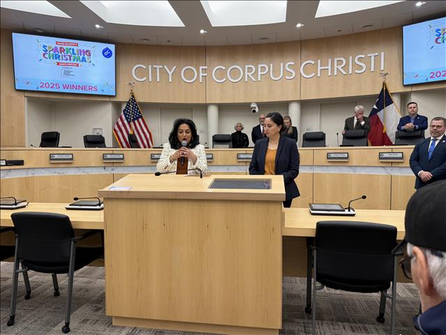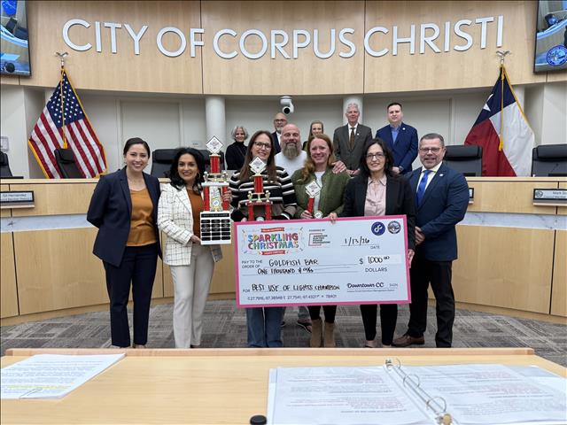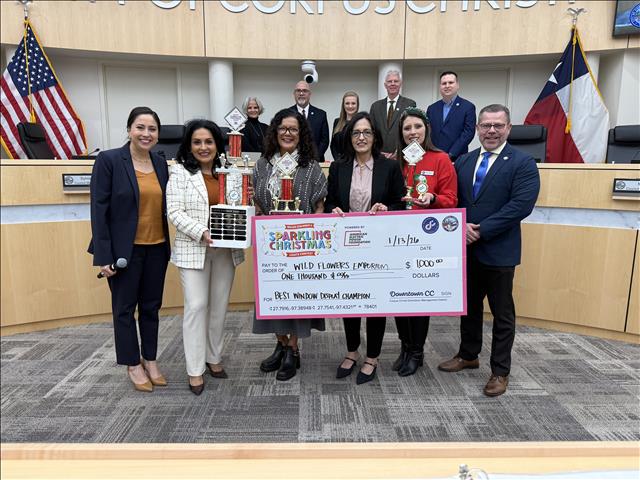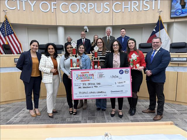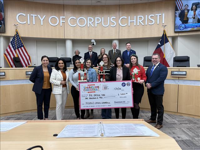 The Corpus Christi Downtown Management District and AEP Texas Regional External Affairs Manager Gricelda Calzada announced the winners of the 2025 Mayor’s Merriest Christmas contest, sponsored by the AEP Foundation, on Tuesday, Jan. 13 during the City Council meeting.
